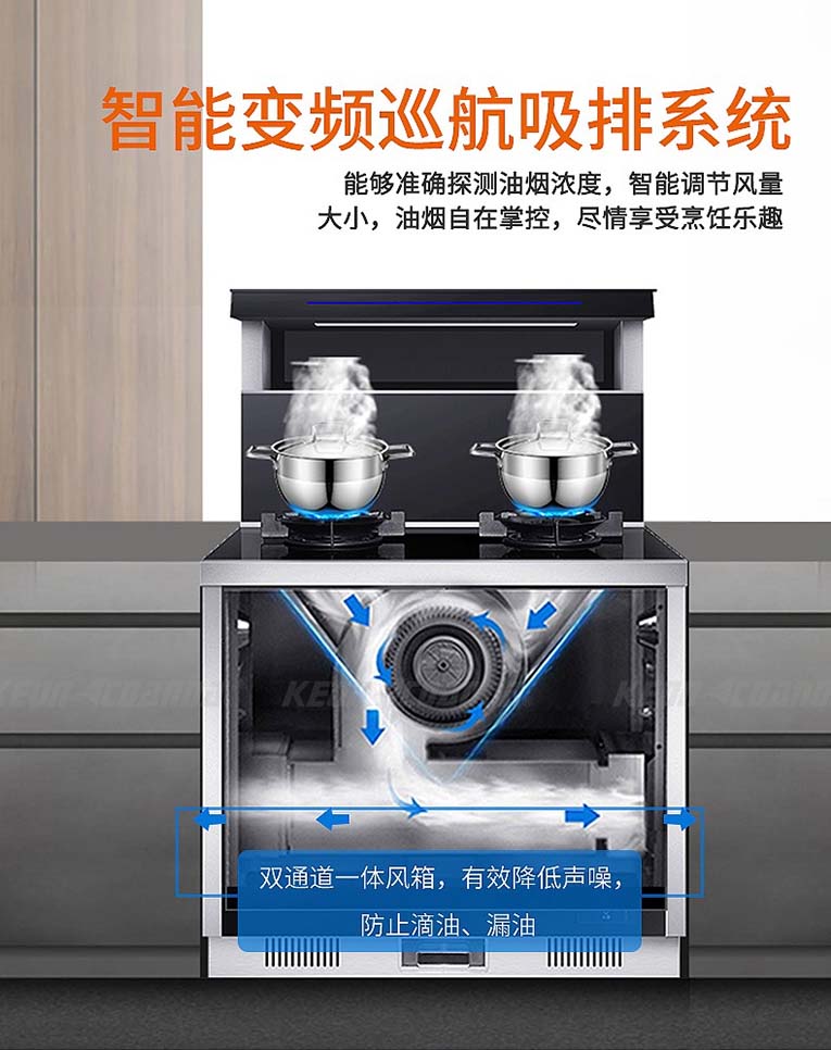 科恩D151X變頻大吸力集成灶功能實(shí)現(xiàn)多樣化,上炒下蒸烤能同時(shí)進(jìn)行,蒸烤過(guò)程耗時(shí)短、效率高,噴氣式4D立體蒸技術(shù)保留了食物的原滋原味,采用智能變頻巡航吸排系統(tǒng),能夠準(zhǔn)確探測(cè)油煙濃度,智能調(diào)節(jié)風(fēng)量大小,油煙自在掌控,最大幅度減輕油煙排出的阻力和熱量,排油煙更通暢、更高效、更徹底,油煙吸凈率更高,讓油煙無(wú)處可逃。