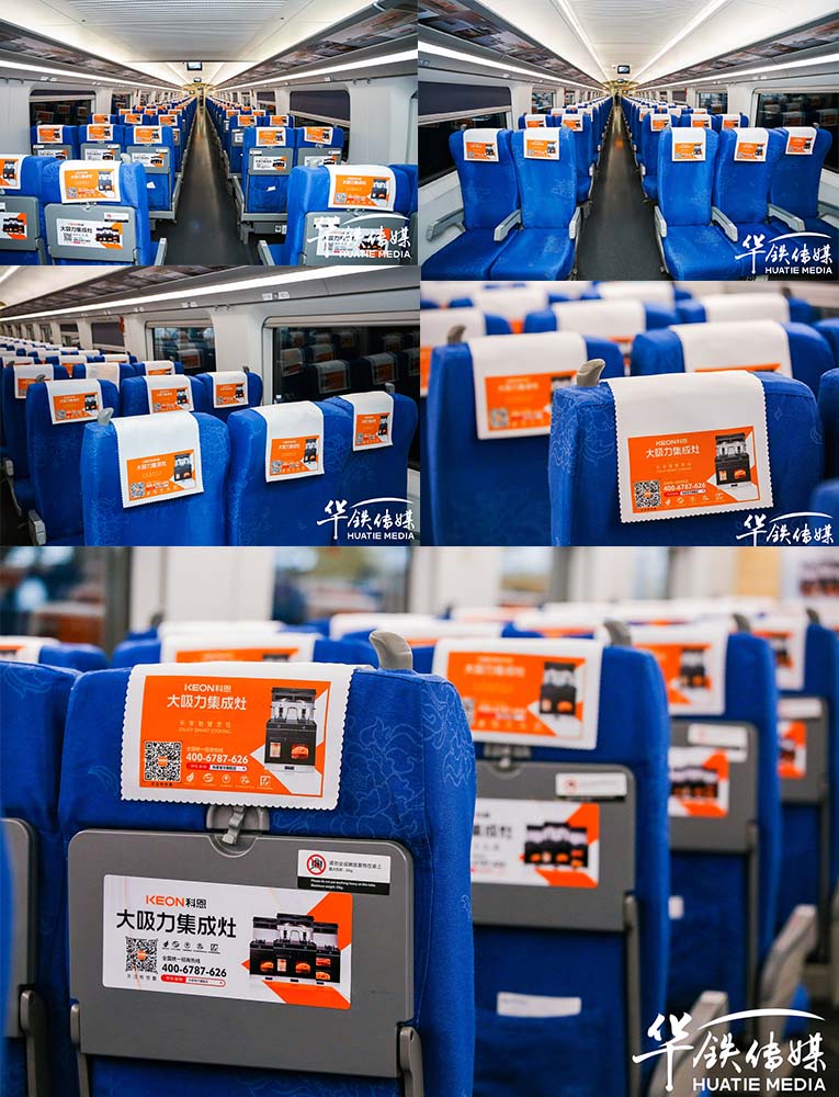 走進“科恩號”車廂,從天幕、海報、電子屏到小桌板,都是來自科恩集成灶的霸屏推送。