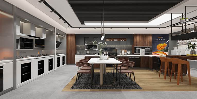 科恩新門店簡約、大氣、精美的視覺沖擊讓人印象深刻,開放式瀏覽路徑,通過“視覺+產(chǎn)品+體驗”的融合,以差異化彰顯品牌個性,讓消費者通過感知產(chǎn)品來感受品牌,對多個區(qū)域進行場景重構(gòu),產(chǎn)品陳列區(qū)、廚房場景、品牌背書、洽談區(qū)等,通過模塊化的方式,將核心產(chǎn)品模塊以及開放式廚房體驗場景植入門店。