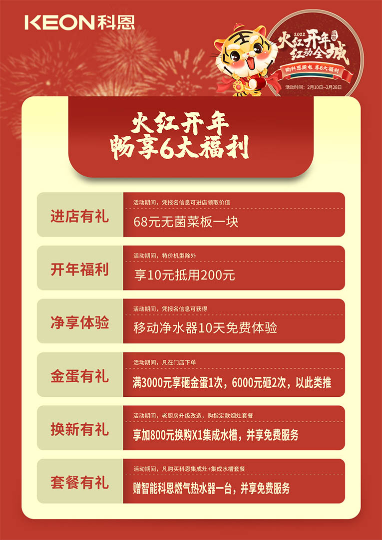 火紅開年,暢享6大福利,2月10日——2月28日前往集成灶十大品牌、廚電行業(yè)十大品牌科恩集成灶全國各大專賣店,就能享受以下特權(quán):進店有禮,活動期間憑報名信息可進店領(lǐng)取價值68元無菌菜板一塊;開年福利進門店享10元抵用200元福利,特價機型除外;凈享體驗,活動期間憑報名信息可獲得科恩移動凈水器10天免費體驗;金蛋有禮,活動期間凡在門店下單,滿3000元享砸金蛋1次,6000元砸2次,以此類推;換新有禮,活動期間老廚房升級改造,購指定款煙灶套餐,享加800元換購X1集成水槽,并享免費服務(wù);套餐有禮,活動期間凡購買科恩集成灶+集成水槽套餐,贈智能科恩燃氣熱水器一臺,并享免費服務(wù)。