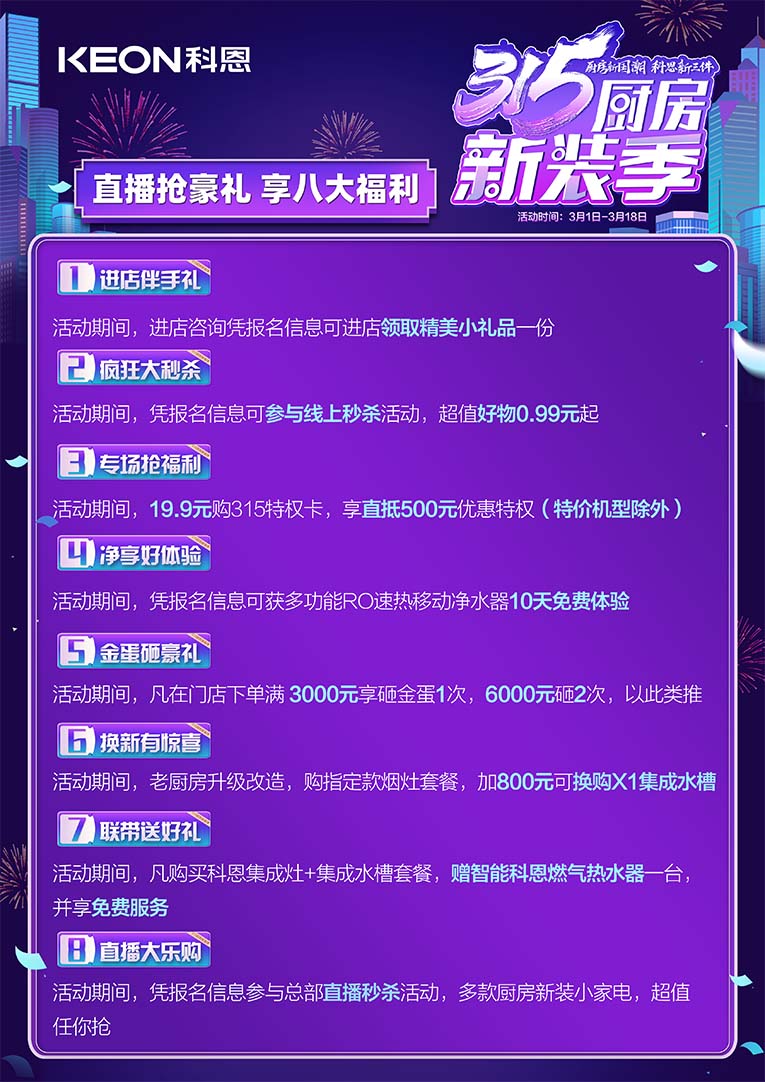 廚房新國潮,科恩新三件~科恩集成灶315廚房新裝季,八大特權(quán)限時(shí)大放送!!一進(jìn)店伴手禮,活動(dòng)期間進(jìn)店資訊憑報(bào)名信息可領(lǐng)取精美小禮品一份;二瘋狂大秒殺,憑報(bào)名信息可參與線上秒殺活動(dòng),超值好物0.99元起;三專場(chǎng)搶福利,活動(dòng)期間19.9元購315特權(quán)卡,享直抵500元特惠特權(quán)(特價(jià)機(jī)芯除外);四凈享好體驗(yàn),活動(dòng)期間憑報(bào)名信息可獲多功能RO速熱移動(dòng)凈水器10天免費(fèi)體驗(yàn);五金蛋砸豪禮,活動(dòng)期間凡在門店下單滿3000元享砸金蛋1次,6000元砸2次,以此類推;六換新有驚喜,活動(dòng)期間老廚房升級(jí)改造,購指定款煙灶套餐,加800元可換購X1集成水槽;七聯(lián)帶送好禮,活動(dòng)期間凡購買科恩集成灶+集成水槽套餐,贈(zèng)智能科恩燃?xì)鉄崴饕慌_(tái),并享免費(fèi)服務(wù);八直播大樂購,活動(dòng)期間憑報(bào)名信息參與總部直播秒殺活動(dòng),多款廚房新裝小家電,超值任你搶!