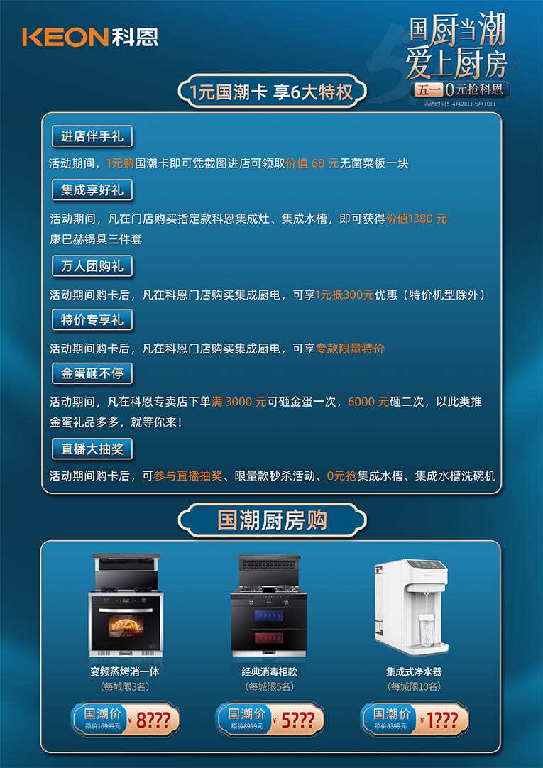 五一黃金周來臨,為了讓千萬家庭享受“廚房新國潮科恩新三件”帶來的魅力,科恩集成灶持續發力,全國聯動擼起袖子,“國廚當潮,愛上廚房”五一0元搶科恩,4月28日-5月10日,進科恩集成灶全國門店,六大特權傾情放送!