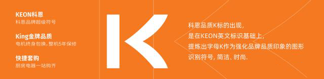 并在KEON英文標(biāo)識基礎(chǔ)上,提煉品牌超級符號“K”,作為強(qiáng)化品牌品質(zhì)印象的識別符號,也是King金牌品牌(電機(jī)終身包換,整機(jī)5年保修),更是快捷套購(廚房電器一站購齊)。