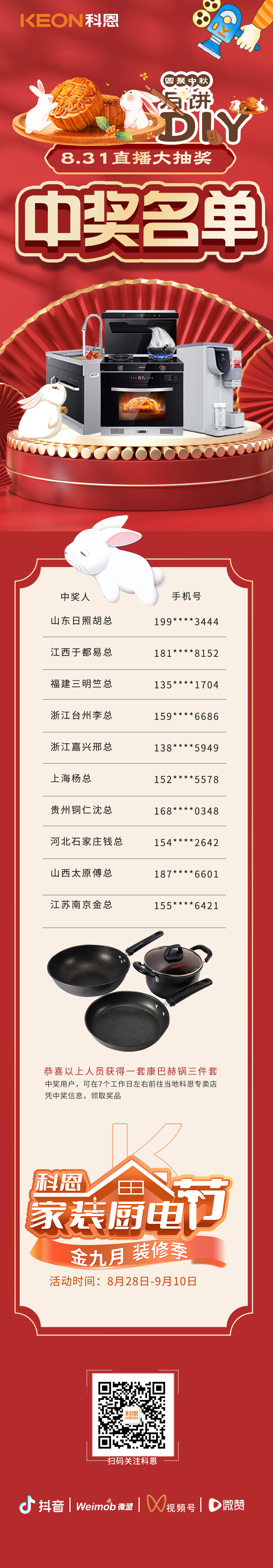 8月31日晚7點(diǎn),科恩家裝廚電節(jié)直播第一期——圓聚中秋,月餅DIY已順利錄下帷幕,直播現(xiàn)場精彩紛呈,不僅有主播手把手教做科恩私房月餅,更有購1元廚電特權(quán)卡抽大獎活動!此時(shí)此刻,想必屏幕前的你們一定非常關(guān)注獲獎結(jié)果,話不多說,快來看看,這次獲獎名單中有你嗎?