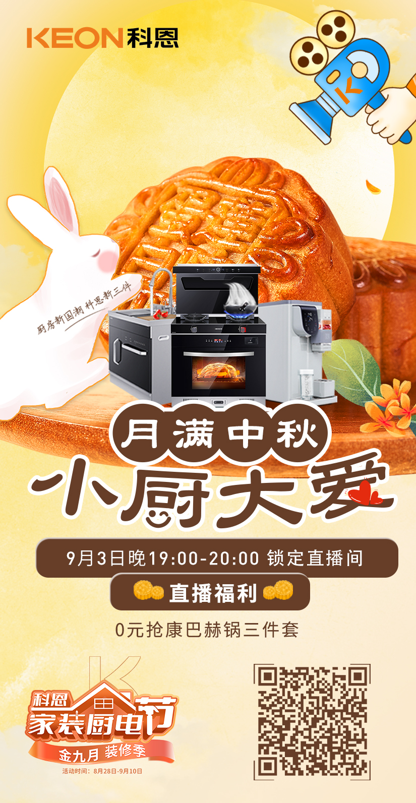 金九月·裝修季——科恩家裝廚電節(jié)【月滿中秋 | 小廚大愛】第二期月餅DIY直播將于9月3日晚7點準(zhǔn)時開播,鎖定科恩直播間,提前購1元廚電美食卡獲抽獎資格一起來看直播做美食中大獎吧!