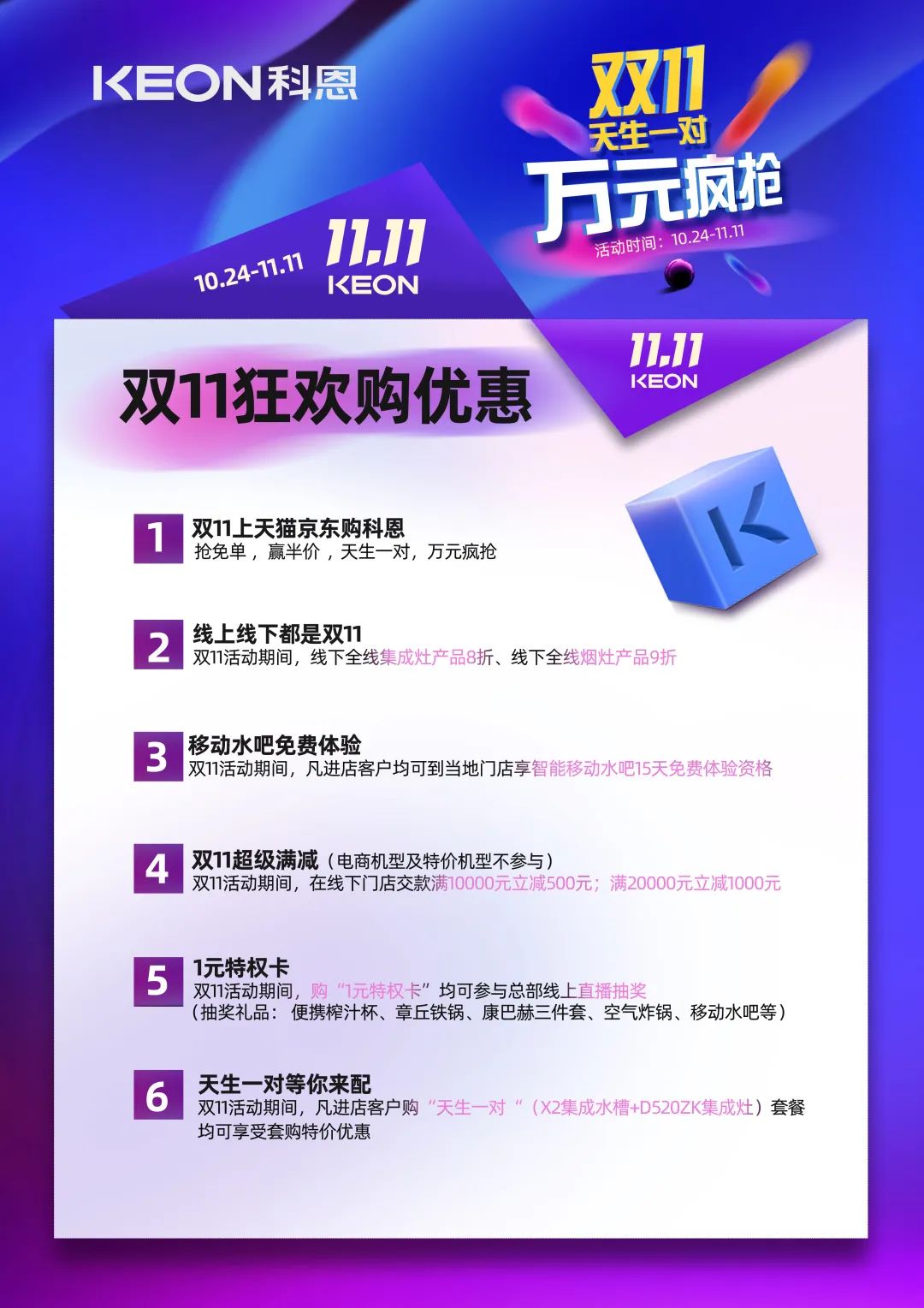 10月24日-11月11日,全國科恩門店、天貓、京東,三點聯動,線上線下都是雙11!