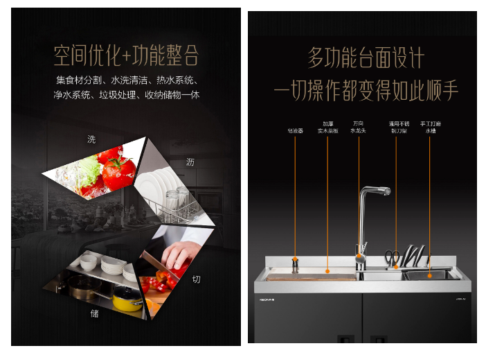 空間優(yōu)化+功能整合,集食材分割、水洗清潔、熱水系統(tǒng)、凈水系統(tǒng)、垃圾處理、收納儲物于一體,多功能臺面設(shè)計,皂液器、加厚實木菜板、萬向水龍頭、通用不銹鋼刀架、手工打磨水槽等功能,每一處細節(jié)堪稱完美,整體造型優(yōu)美別致,同時兼顧實用性。