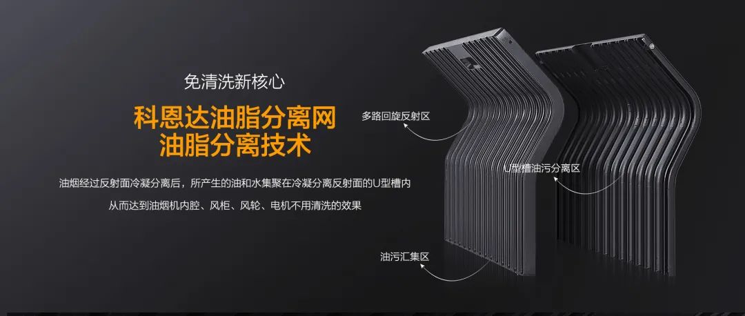 科恩免清洗煙機獨創科恩達油脂分離網,采用易潔太空壓鑄鋁材,經過酸洗-噴砂工藝加之特氟龍噴涂最后高溫燒結,不僅不沾油、易清潔更好打理。在分離油煙的同時,還能阻燃阻熱!
