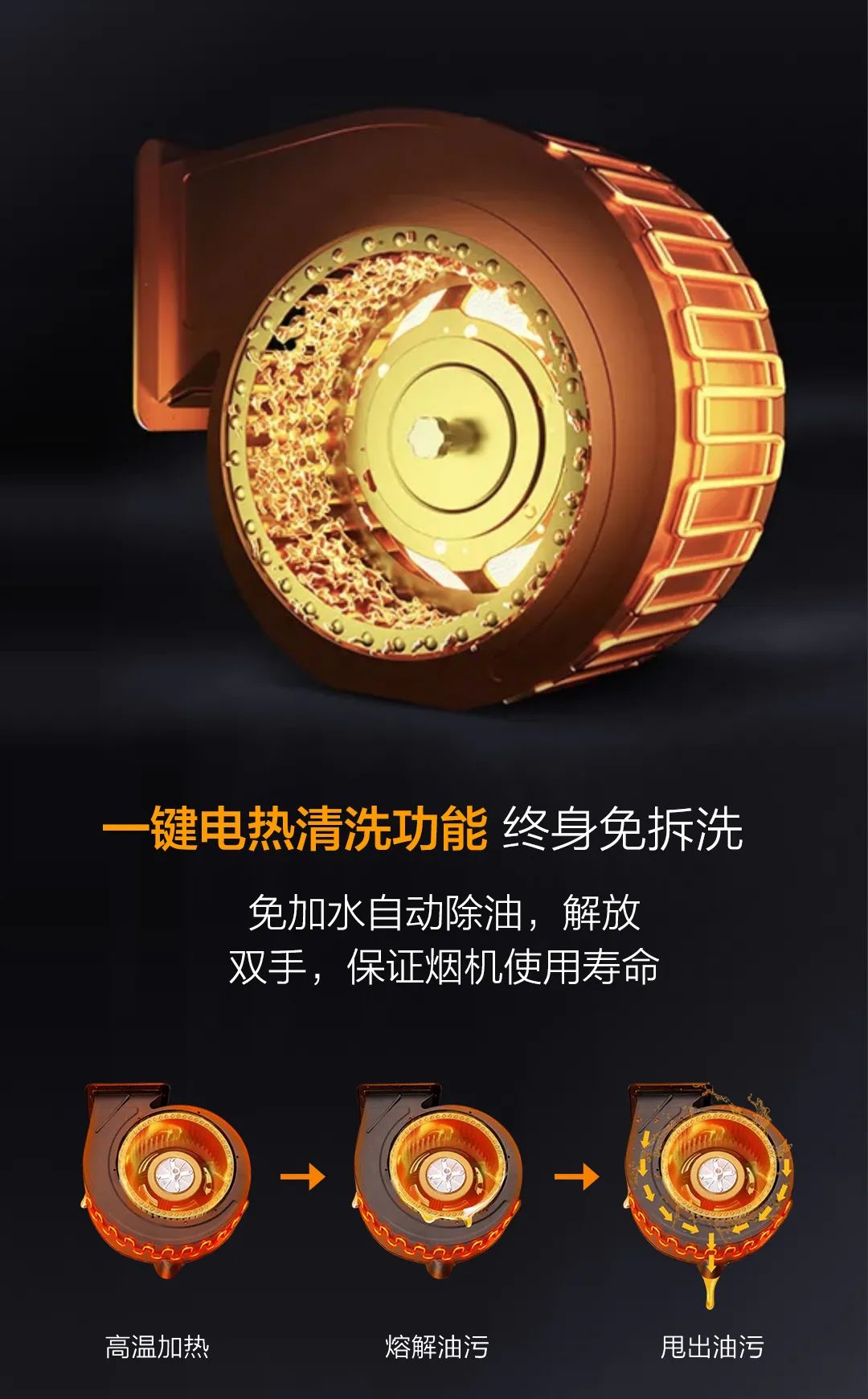 科恩免清洗煙機標配智旋洗,高溫電加熱,有效熔化風柜內壁和葉輪上的部分油垢,再通過風輪的離心力將油污甩到室外和過濾到油杯,從而完成清洗全過程,但即使這樣也無法解決風輪長年累月因油脂油污附著負荷工作而造成的吸力下降,吸煙效果變差,清洗打理困難,甚至煙機抖動和安全等諸多問題......