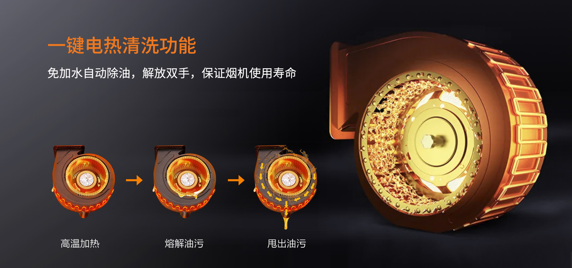 對于煙機清洗一直以來都被稱為廚房最強“洗”事,科恩T71采用一鍵電加熱清洗,無需拆卸,只需一鍵啟動就可將渦殼上的電加熱膜進行加熱,通過油垢溶解流出的方式來清理煙機內部,同時,渦殼內的高溫還可使風輪上的油垢軟化,隨著風輪的轉動將油垢甩出。