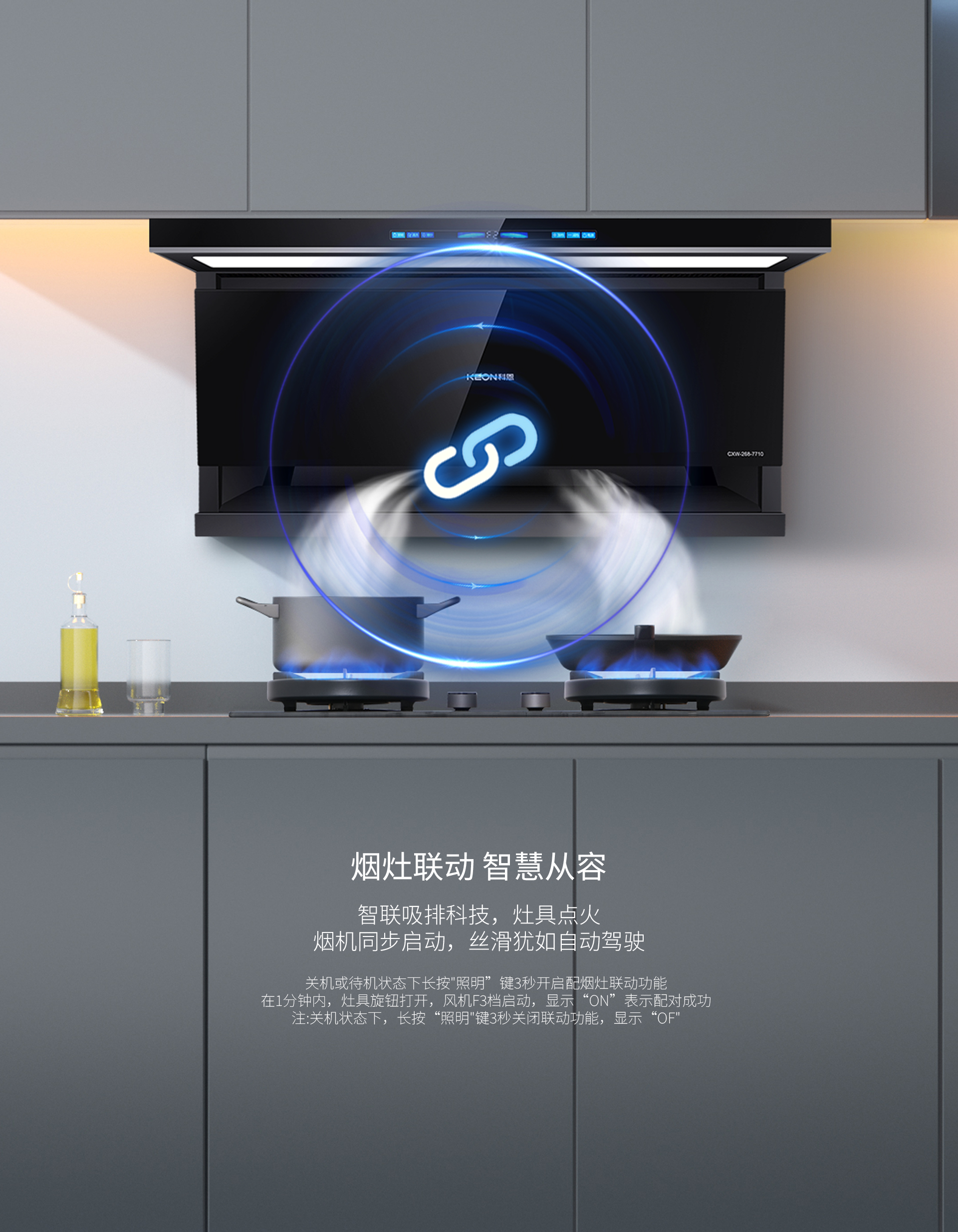 讓科恩7710智能聯(lián)動煙機走進父母的廚房,告別油煙滋擾,用科技的力量為他們的健康保駕護航。在每一次烹飪中,讓愛與健康相伴,讓這份含蓄而深沉的親情在無煙的廚房中愈發(fā)濃郁。