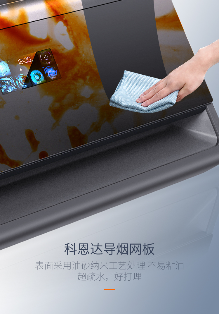 7270整機采用特氟龍工藝,一體拉伸沖壓成型,美觀大氣,一擦即凈。磁吸式科恩達網(wǎng)板,一拉一提,拆卸清洗簡單方便,科恩達網(wǎng)板表面采用油砂納米科學工藝,讓油污難以附著,超疏水自清潔。電加熱清洗功能,自動甩掉油污。保持煙機強勁吸力,清潔不再是難題。