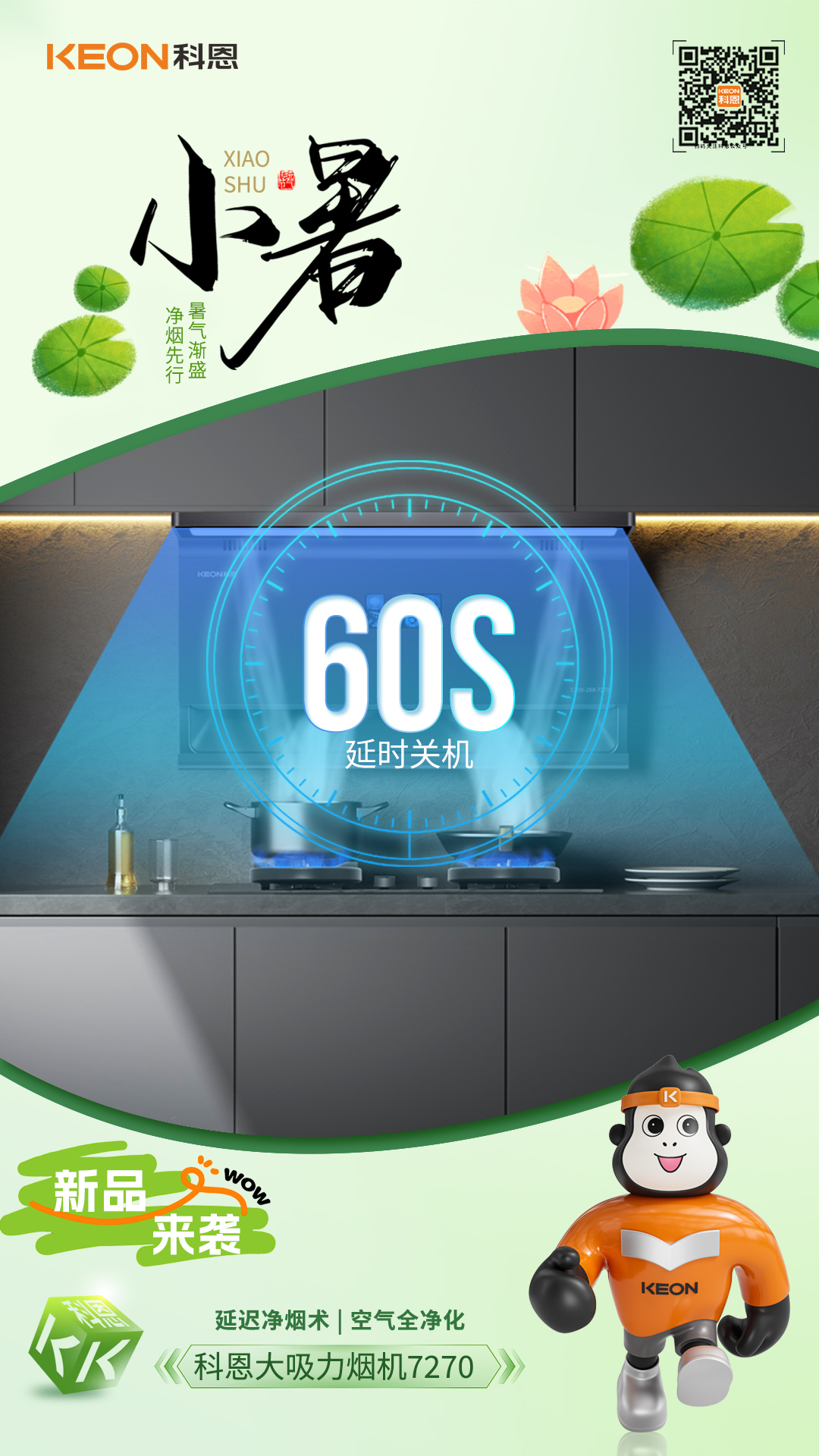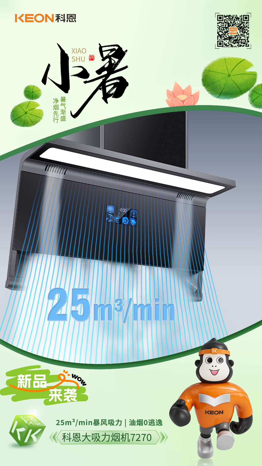 蟬鳴初起,熱浪翻涌。小暑時節(jié)廚房成高溫重災(zāi)區(qū),油煙升騰中包裹著暑氣更顯煩躁,科恩7270煙機攜25m³/min暴風吸力來襲,為廚房筑起清涼防線,讓凈煙快一步,生活慢享受。