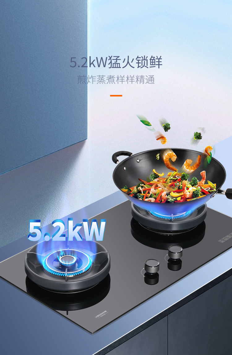 舊灶換新生,廚房有新意。臺嵌兩用,換新優選??烧{節底盤設計,換灶零門檻,不擴孔不改孔,老廚房無縫升級。科恩KN530灶具即將來襲,安裝無拘束,安全常在線,解鎖烹飪新體驗。黑晶美學,廚房新名片。黑晶鋼化玻璃面板,輕奢大氣,抗爆耐刮,防滑旋鈕拒絕燙手尷尬,采用鋁合金爐頭,防生銹耐腐蝕,讓灶臺變身藝術品展覽區。5.2KW猛火是爆炒的底氣,激發食材本味,享受大廚風味。0°-170° 的寬域控火藏著細膩,收放自如,多種烹飪模式輕松應對。多重凈燃科技,高效倍省氣,KN530灶具,點燃你的烹飪熱情。