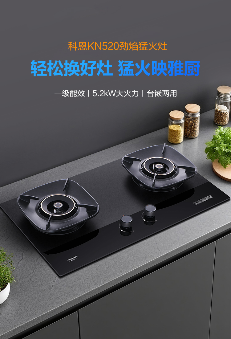 免改煥新,秒換好灶。老舊灶具換裝難,拆改打孔費時間,科恩KN520臺嵌兩用,免改孔徑零門檻,黑色油砂納米面板,油污一擦即凈,高亮旋鈕防燙隔熱,指尖操作更安心。無需折騰舊廚房,煥新只需舉手間,讓老房廚房輕松升級無負擔。猛火寬域,味鮮效高。5.2kW三噴猛火,爆炒鎖鮮不留痕,0-170°無極調火,文火慢燉更入味。上銅下鋁火蓋設計,導熱均勻不夾生航空級鋁合金燃燒器,耐高溫不易變形,超70%新標一級能效,省氣省錢減開支。猛火不費氣,家常也能出大廚味。易潔防爆,安全護航。可拆卸火蓋設計,深度清潔無死角。鋁合金爐頭防堵防銹,耐用十年依舊新,黑色啞光爐架聚能防風,火苗穩定不跑偏。意外熄火即刻斷氣,湯汁溢出不慌神。防爆抗砸面板加持,廚房安全雙保險。烹飪無憂,健康呼吸伴三餐。