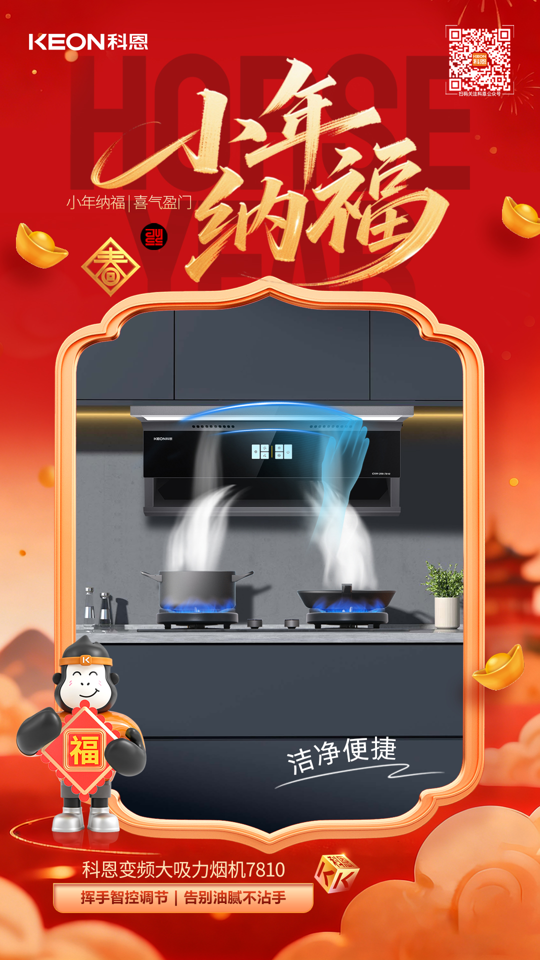 小年祭灶祈安康,科恩7810煙機(jī)以凈煙實(shí)力守護(hù)團(tuán)圓之美。它讓廚房告別油煙困擾,以顏值點(diǎn)亮家居,用智能簡化操作,用健康貫穿始終。這個(gè)小年,讓科恩煙機(jī)陪伴你洗凈舊塵、烹煮佳肴,在清新潔凈的廚房中,迎接福氣滿盈的新春。