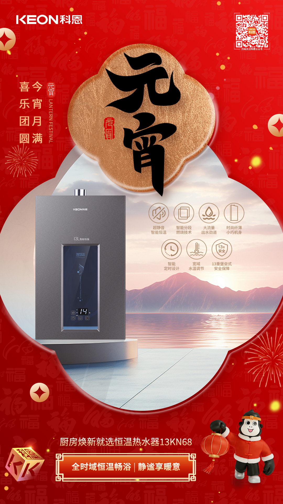 元宵餐后洗漱,怎能少了恒溫熱水?科恩13KN68以13L大容量滿足全家需求,寬域調溫,無論是洗手潔面還是舒適沐浴,都能精準控溫。智能分段燃燒技術搭配無氧銅水箱,熱效率高達89%,節能又高效。