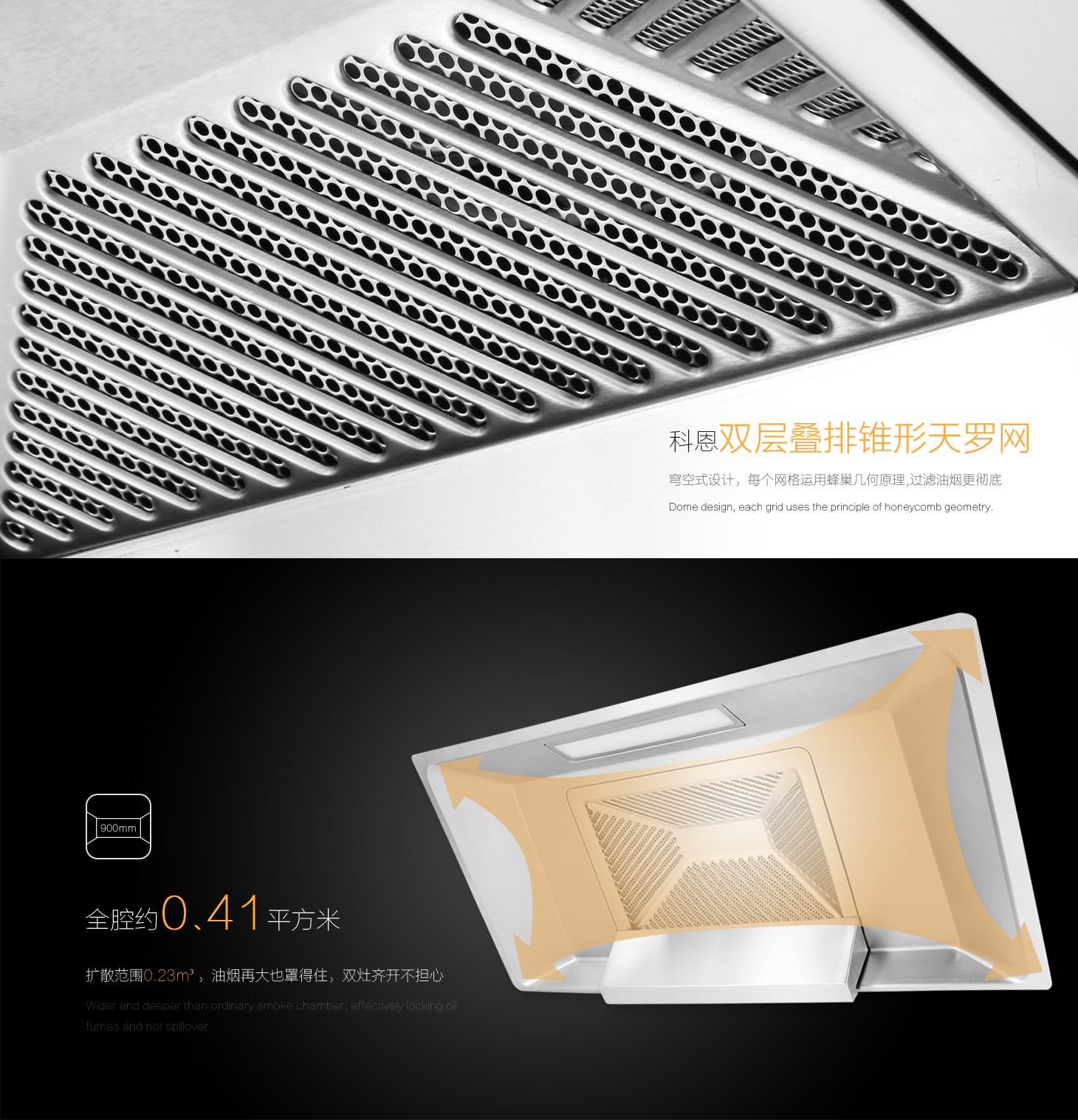 • 全腔900MM攏煙區,比普通煙腔更寬更深,有效鎖住油煙不外溢。