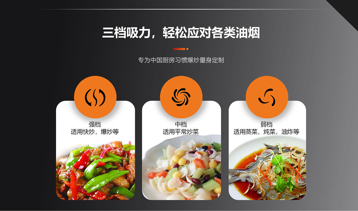 • 三檔吸力,輕松應對各類油煙,專為中國廚房習慣爆炒量身定制