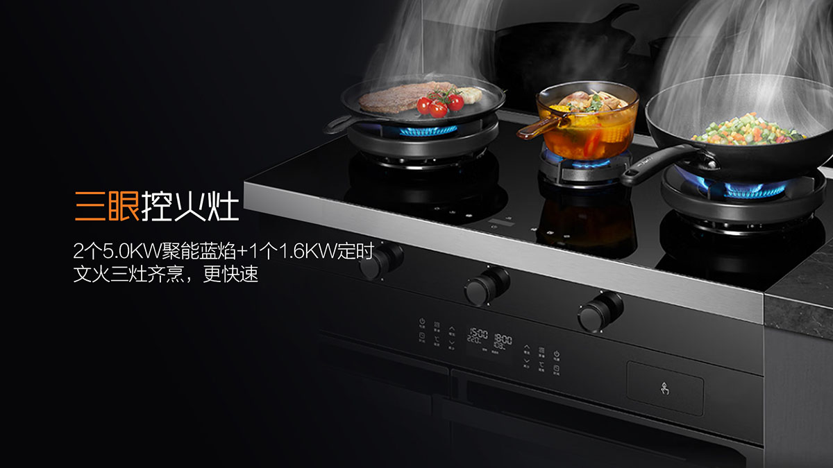 • 三灶同烹,5.0kW猛火爆炒+1.6kW文火慢燉,高效全能,美味加速