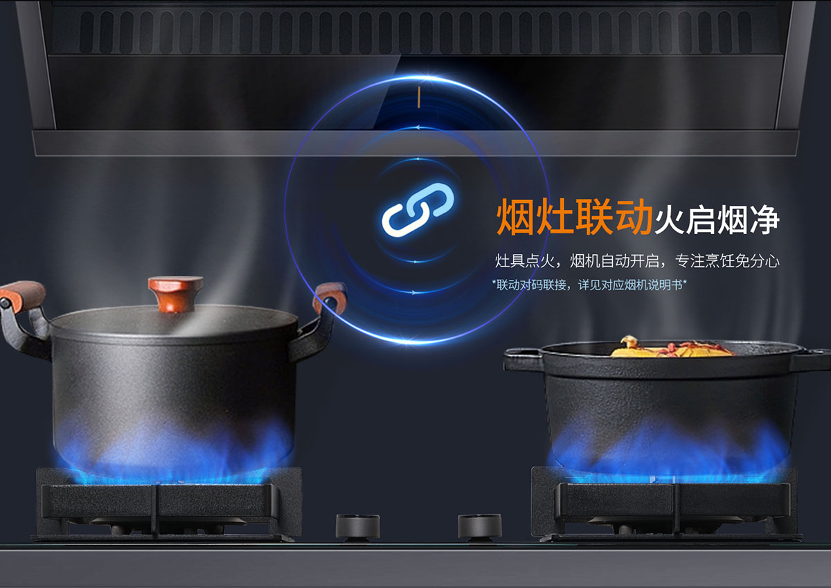 • 煙灶聯動,火啟煙凈,專注烹飪免分心