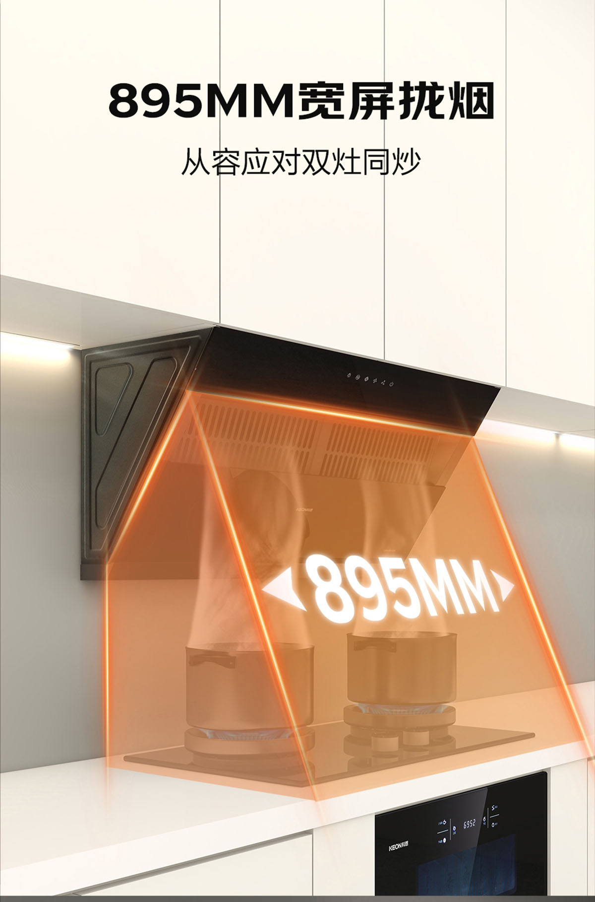 - 895MM寬屏攏煙,雙灶同烹,從容應對