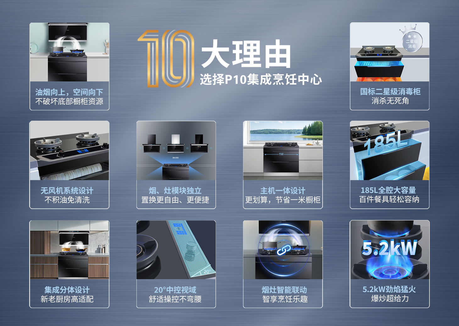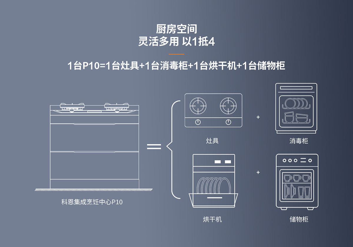 • 以1抵4,1臺P10=1臺灶具+1臺消毒柜+1臺烘干機+1臺儲物柜