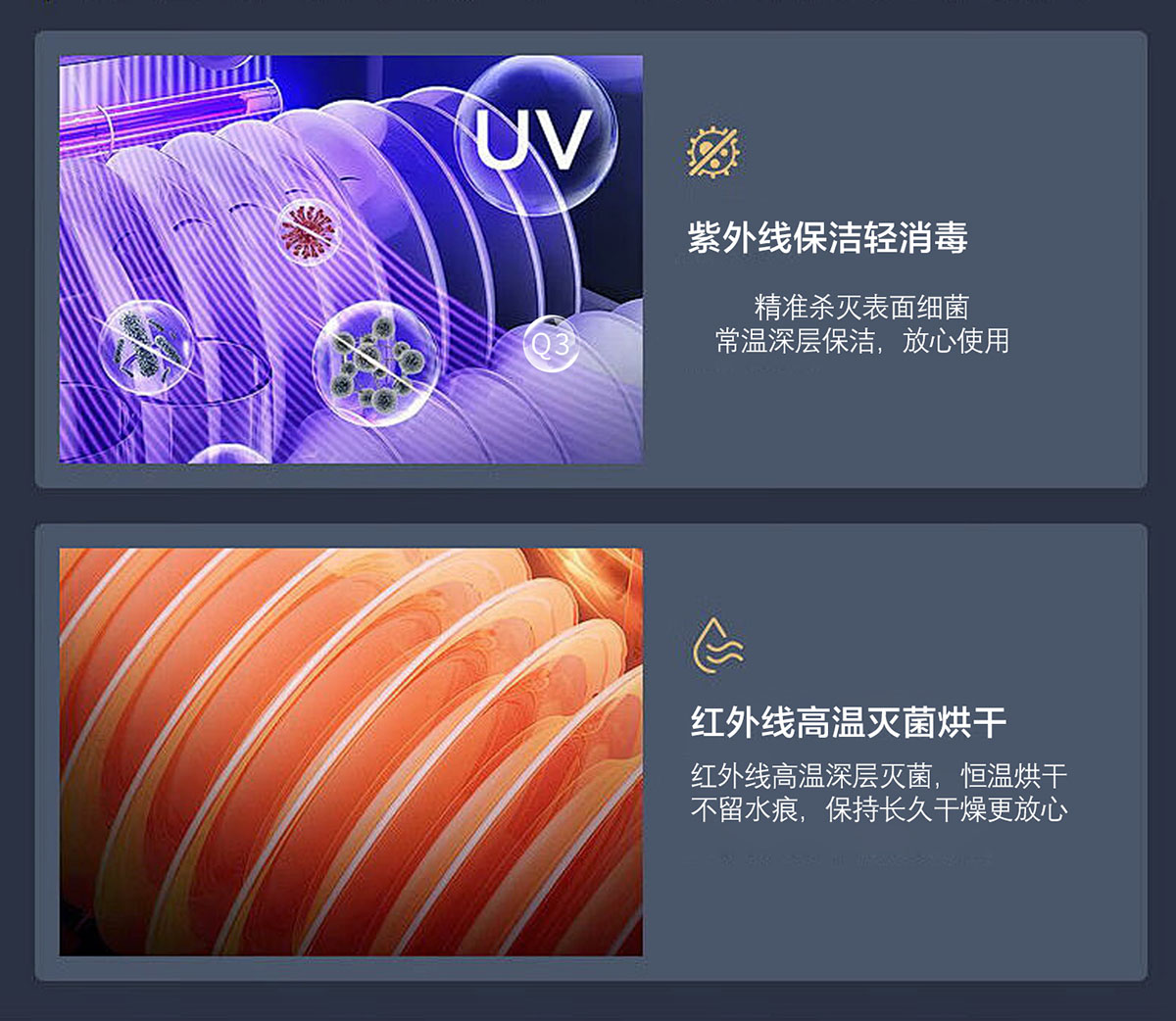 • 臭氧+紫外線+遠紅外線三重立體消殺,餐具清新又干爽