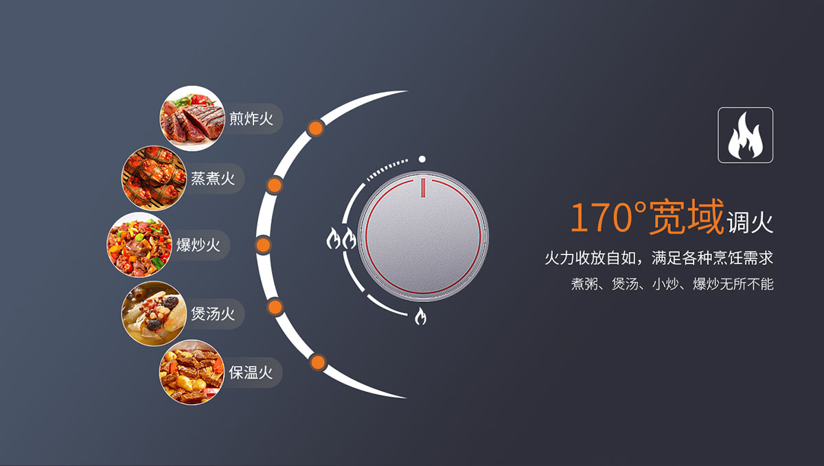 - 無極寬域調(diào)火,0°-170°收放自如,滿足各種烹飪火力需求