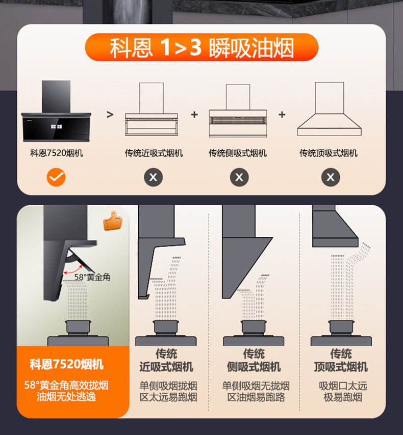 • 采用58°黃金開合角,緊鎖油煙不逃逸