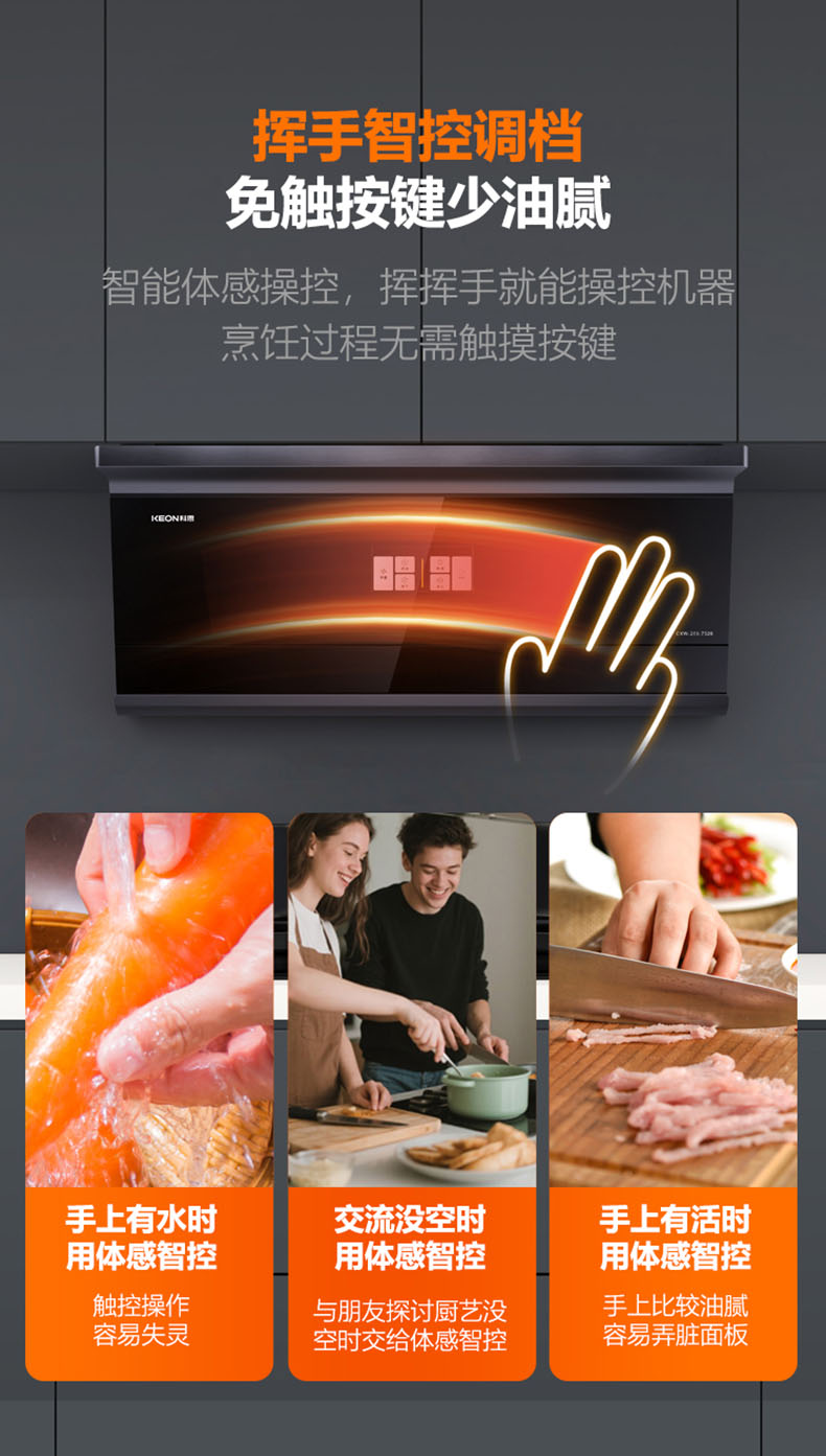 • 揮手智控,零觸碰調節操作面板,讓油污不沾手