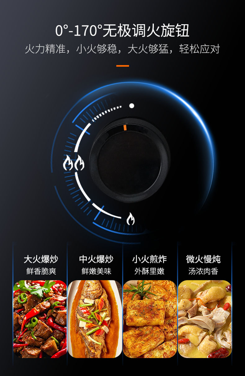 - 0°-170°無(wú)極調(diào)火旋鈕,精準(zhǔn)控溫,烹飪得心應(yīng)手